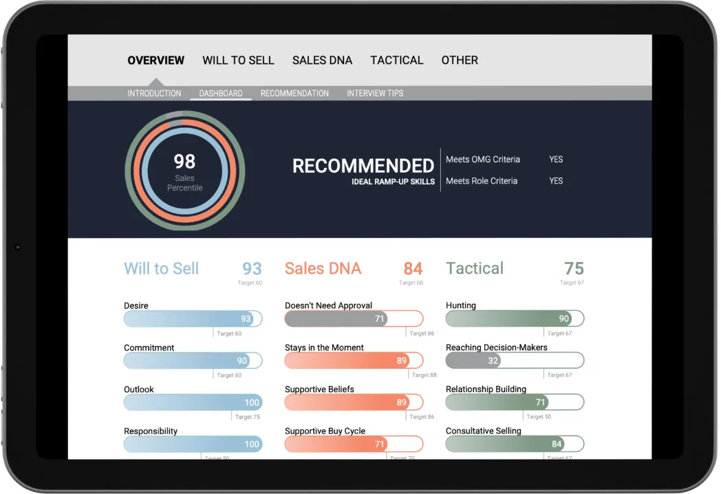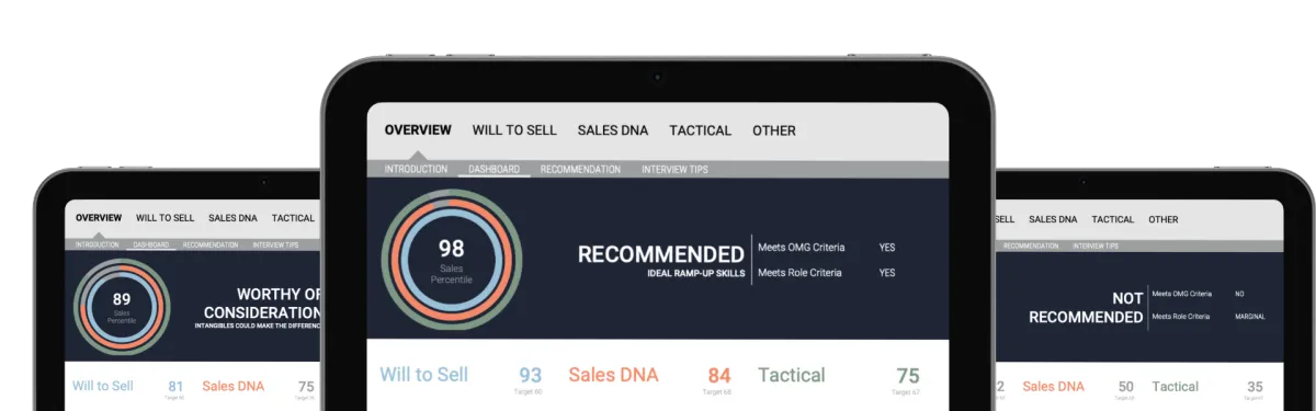 With Unlimited Candidate Assessments, you can screen every applicant at the start. You’ll know who has the will, skills, and mindset to sell—before you ever interview them. That means fewer hiring mistakes, stronger ramp-ups, and a sales team you can trust to deliver.